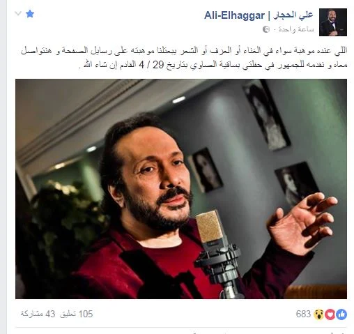 وكتب الحجار على صفحته على موقع التواصل الاجتماعى فيسبوك "اللى عنده موهبة سواء فى الغناء أو العزف أو الشعر يبعتلنا موهبته على رسائل الصفحة وسنتواصل، معه وسنقدمه للجمهور فى حفلتى بساقية الصاوى يوم 29 أبريل القادم، إن شاء الله ".